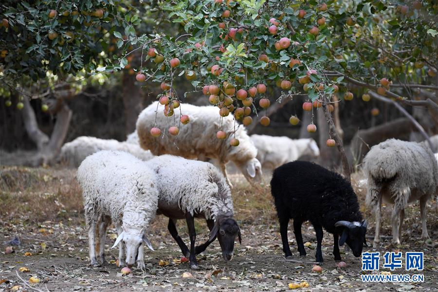 10月24日,羊群在敦煌市郭家堡镇一处果园里觅食。