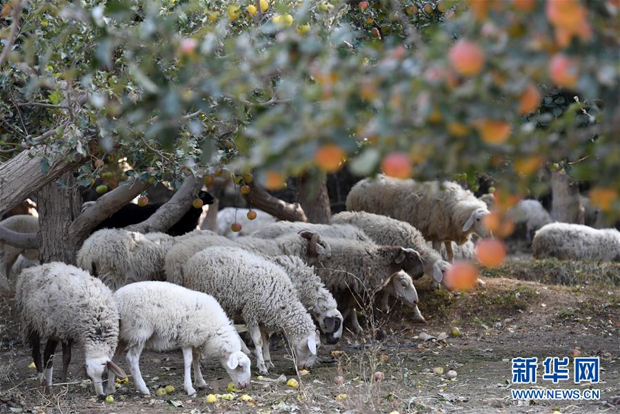 10月24日,羊群在敦煌市郭家堡镇一处果园里觅食。新华社记者 马宁 摄
