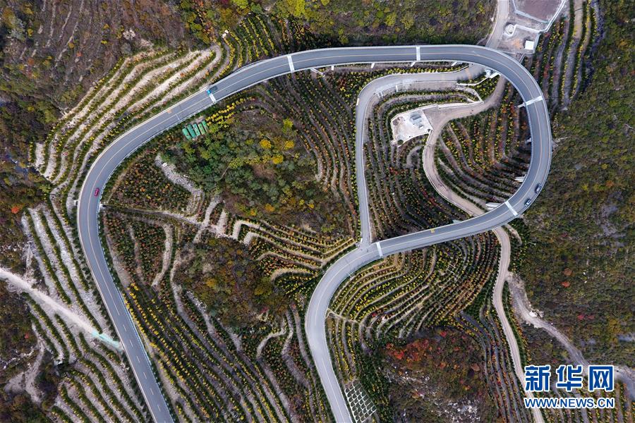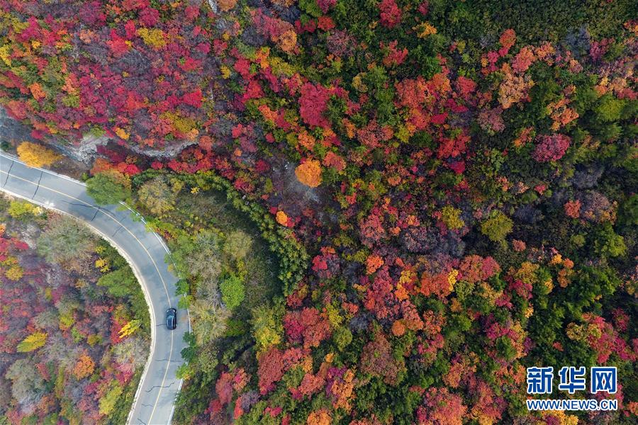 车辆行驶在山西省太原市西山旅游公路上(10月22日无人机拍摄)。
