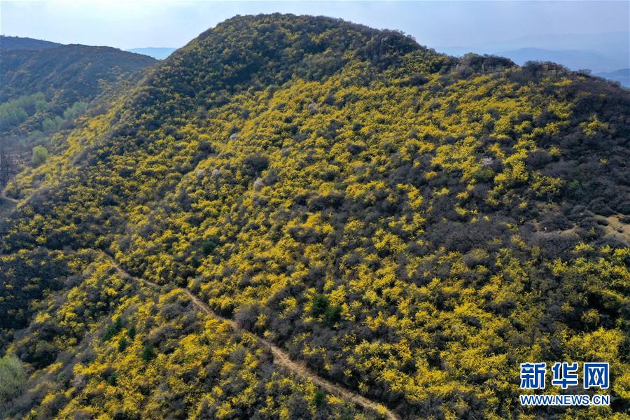 山西省平定县冠山上盛开的连翘花(4月10日无人机拍摄)。