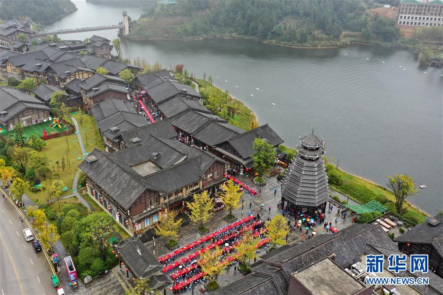 丹寨县万达小镇万人长桌宴(10月26日无人机拍摄)。
