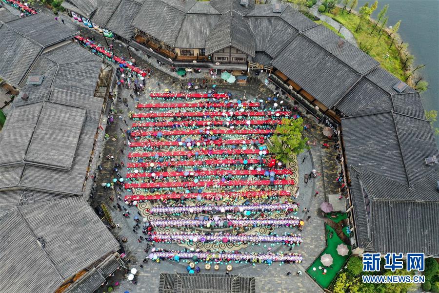 丹寨县万达小镇“万人长桌宴”(10月26日无人机拍摄)。新华社记者欧东衢摄