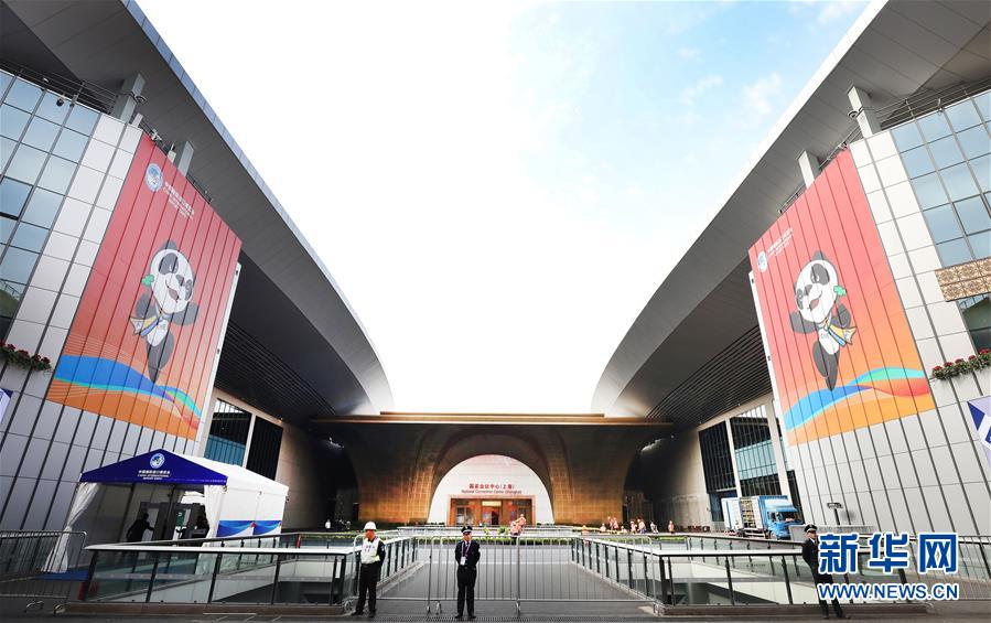 这是10月25日拍摄的国家会展中心(上海)西入口处。 第二届中国国际进口博览会开幕在即,在进博会举办地、国家会展中心(上海)内,展馆搭建施工人员和展会志愿者们在进行从展台搭建到完善观展标识等的布展准备工作。 新华社记者 方喆摄