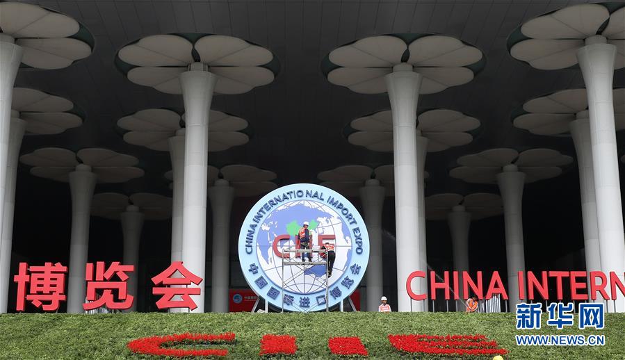 10月25日,施工人员在国展中心(上海)南广场安装进博会标志。 新华社记者 方喆摄