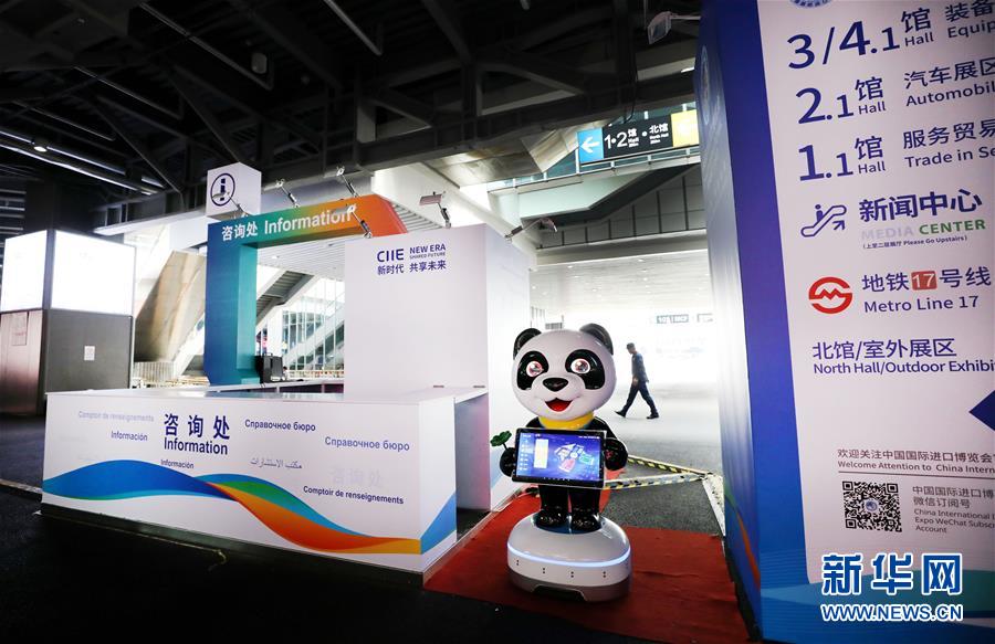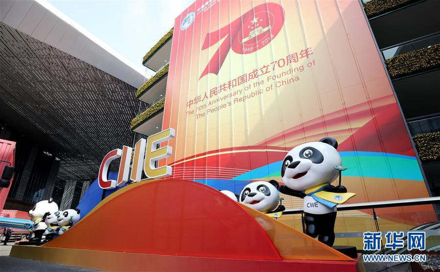 10月25日,位于国展中心内的国家会议中心入口处张贴了醒目的进博会吉祥物熊猫进宝装饰。 新华社记者 方喆摄