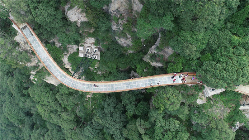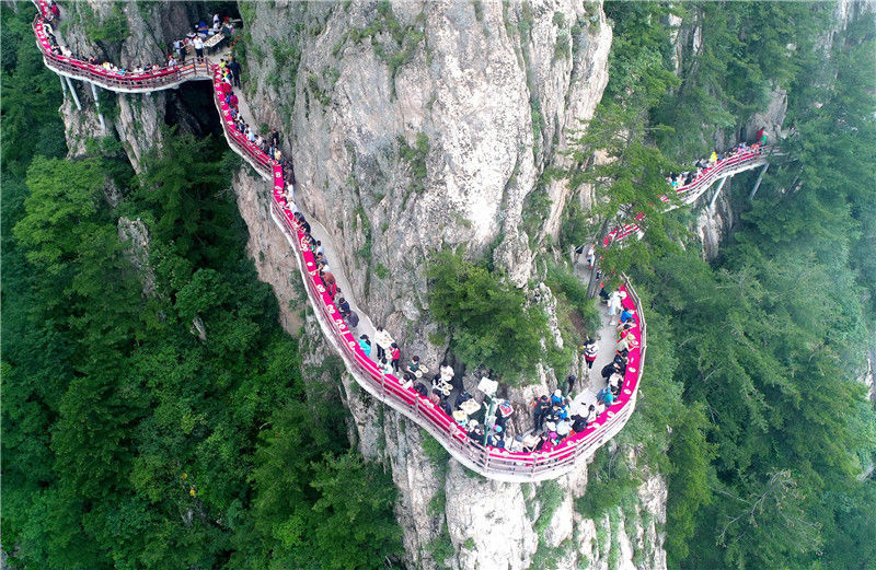 2018年6月23日,陕西渭南,游客们在少华山悬空玻璃栈道上游览拍照。航拍少华山悬空玻璃栈道,下面就是悬崖密林。王警/视觉中国