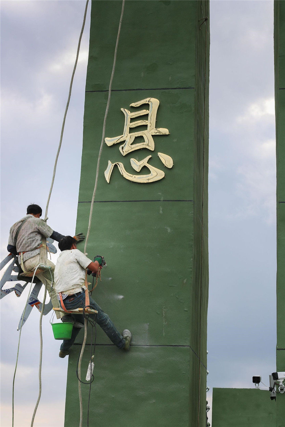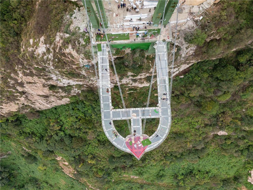 2019年9月20日,从落差198米悬崖上伸出周长60米悬空的“高空玻璃悬廊”在河南南阳七峰山落成,该玻璃悬廊名为“云顶之心”。图为建筑工人进行收尾工作。王中举(河南分社)/中新社/视觉中国编辑/康娜
