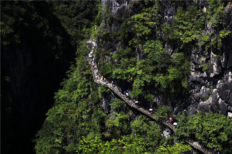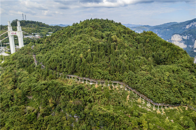 2019年9月13日,游客在重庆市黔江区城市峡谷景区芭拉胡的悬崖栈道上游玩。当天是中秋节假的第一天。杨敏/视觉中国编辑/陈进