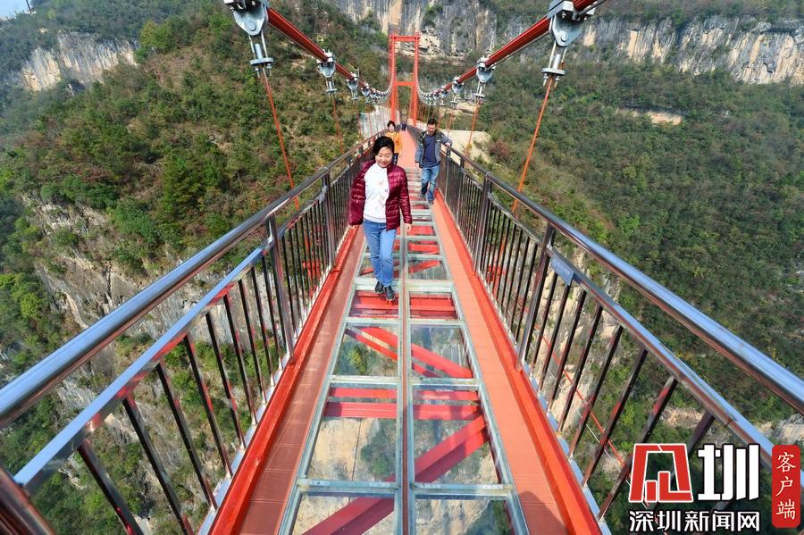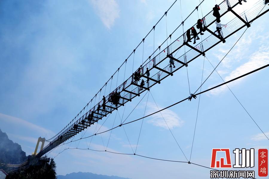 2017年11月5日,游客走在湖北省保康县歇马镇九路寨景区战口河人行悬索桥上观光。