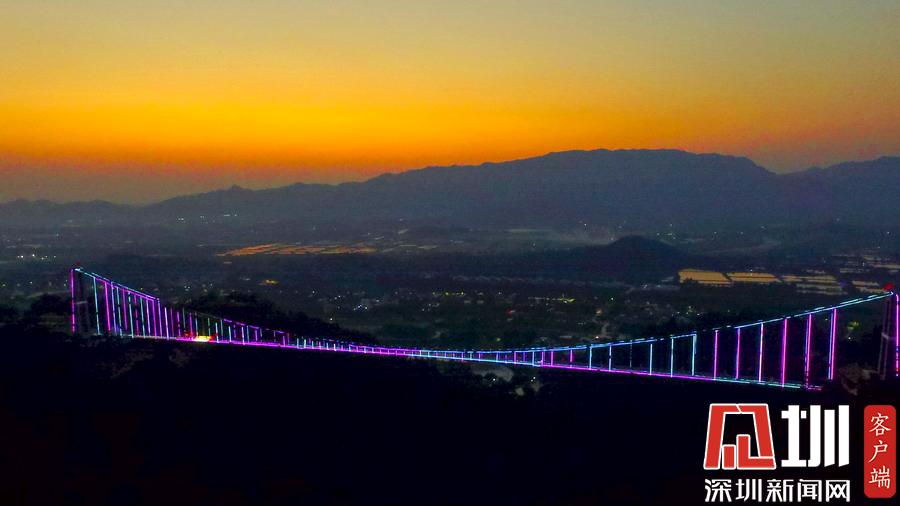 2018年10月7日,广东佛山。网友纷纷称佛山南丹山玻璃桥是广东最美玻璃桥。渐渐地,金灿灿的阳光变为了橙黄色,开始变得柔和,妩媚动人,给美丽恬静的群山抹上一层金光。太阳开始脱去华丽的金丝纱裙,换上了橘黄色的时尚。玻璃桥也穿上了端庄典雅的晚礼服,露出那像蒙娜丽莎一样迷人的笑容。