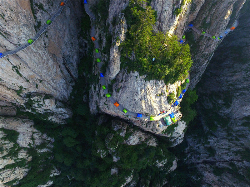 2018年7月21日,河南洛阳老君山,一年一度的帐篷节开幕,驴友在海拔2000余米的悬崖栈道上安营扎寨。DF/视觉中国