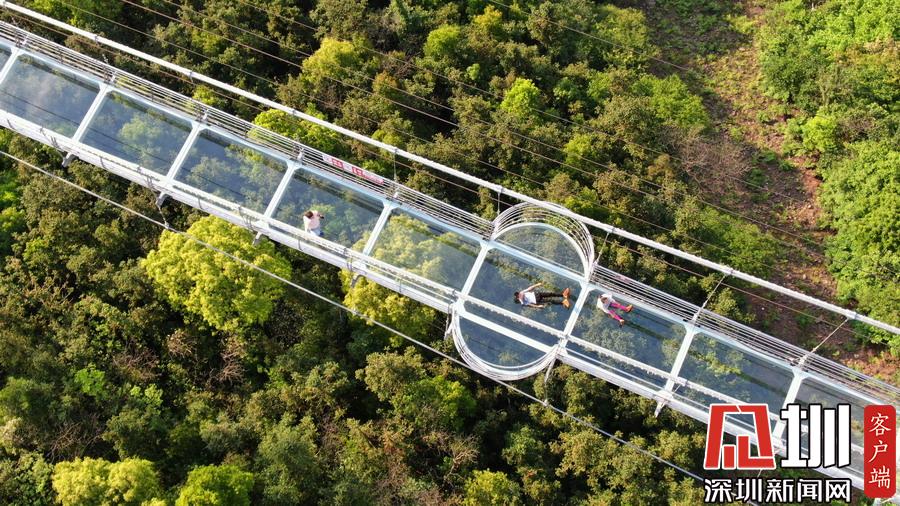 2019年4月24日,湖南张家界大峡谷玻璃桥上,游客们摆出各种姿势拍照。刚开始,游客们在短暂的恐惧之后,随之而来的是满满的兴奋,男女老少纷纷在这座悬在300多米高空中的全透明玻璃桥上不停拍照,从一开始走上桥紧张的不敢踩在玻璃上,到最后在玻璃桥上的各种躺和趴,各种姿势各种创意各种拍摄,游客们完全忘我地开心游玩。张家界大峡谷玻璃桥,是世界首座斜拉式高山峡谷玻璃桥,玻璃桥全长430米,宽6米,桥身距离谷底垂直落差300米,大桥表面由99块透明玻璃铺设而成,整个工程无钢筋混凝土桥墩。