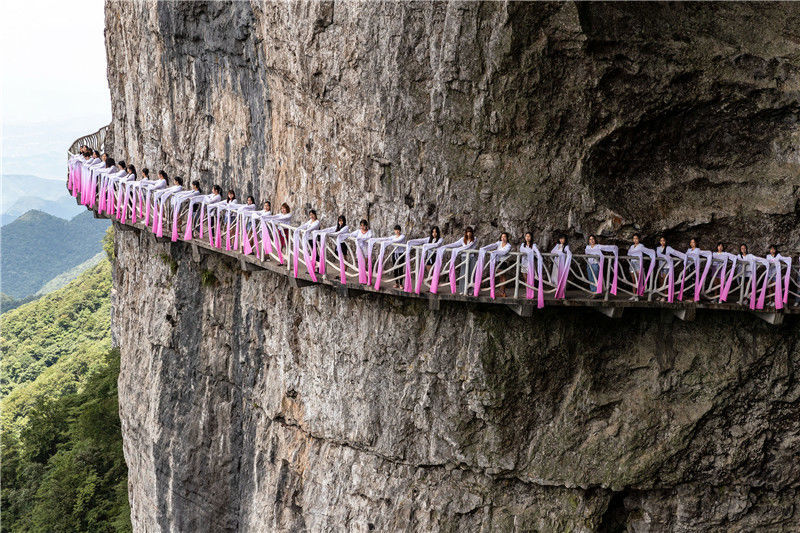 2018年7月29日,水袖舞爱好者在重庆市南川区金佛山绝壁栈道上“秀”水袖舞。瞿明斌/视觉中国