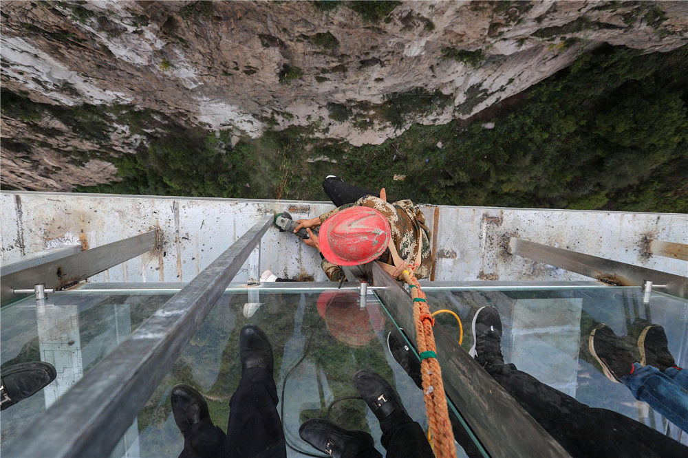 2018年6月28日,广东清远古龙峡的玻璃大峡谷,是集玻璃平台、玻璃栈道、玻璃桥为一体的高空观光玻璃组合,同时融入了5D破裂效果,并设有玻璃悬廊、玻璃台阶、凌空微步等高空挑战产品。曾令华/视觉中国