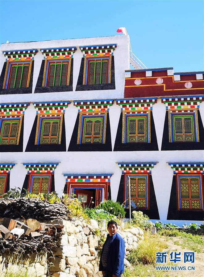 10月29日,在四川省乡城县青德乡仲德村,村民阿布洛绒丹巴和他的白色藏房。新华社记者江宏景摄