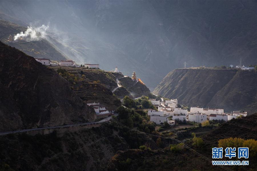 10月29日,在乡城县青麦乡南吾村,清晨的阳光照亮白色民居。深秋时节,四川省甘孜藏族自治州乡城县河谷地带的民居像一颗颗白色珍珠点缀在色彩斑斓的田园中,形成一幅幅藏乡田园画卷。近年来,乡城县打造藏乡田园旅游目的地,以全域旅游带动一二三产业深度融合,成为稻城亚丁环线游上的一颗明珠。新华社记者江宏景摄