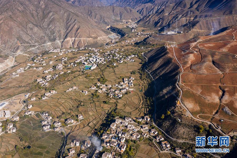 10月29日,俯瞰四川省乡城县的定曲河峡谷的青德乡,白色藏房点缀在田园之中(无人机拍摄)。新华社记者江宏景摄