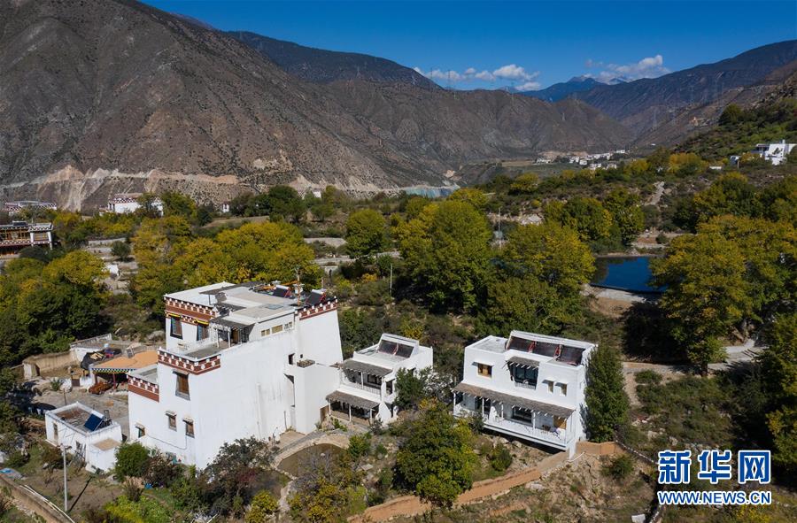 10月29日,四川省乡城县的定曲河峡谷的青德乡,民宿“皈院”保留了白藏房传统民居特色(无人机拍摄)。新华社记者江宏景摄
