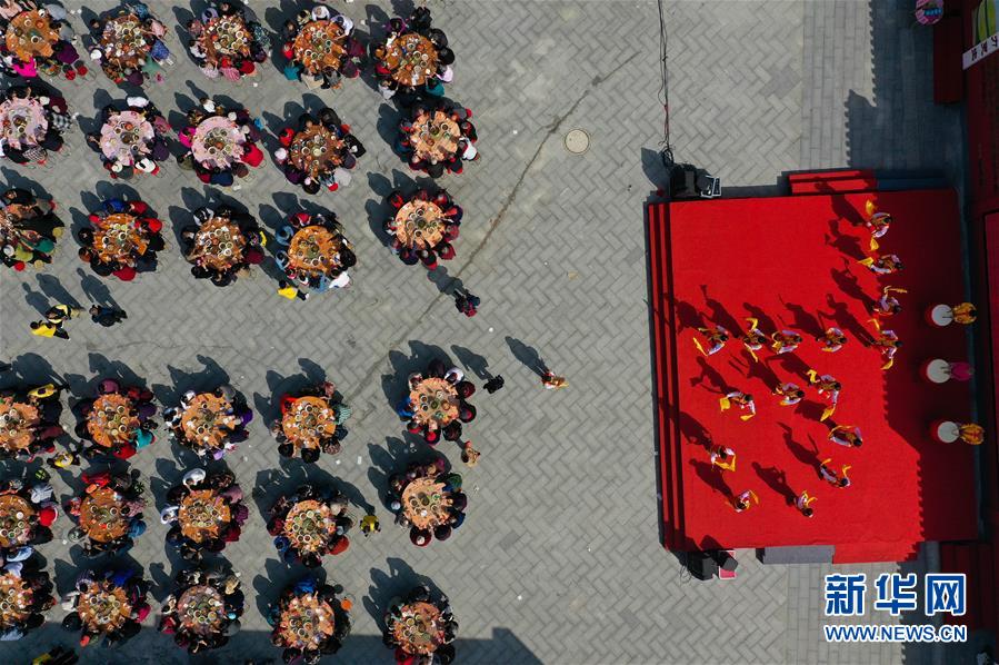 11月2日,南京仙林街道仙林新村社区居民腰鼓队在千家宴上表演助兴(无人机拍摄)。 新华社记者 季春鹏 摄