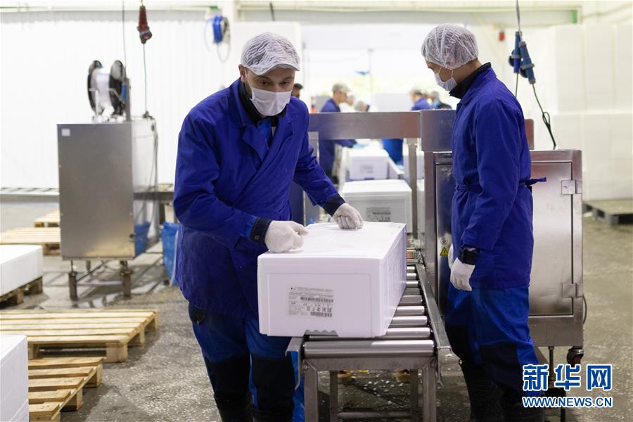 9月13日,在俄罗斯摩尔曼斯克,俄罗斯水产养殖公司工作人员搬运已装箱的鲑鱼。 俄罗斯水产养殖公司是俄罗斯大西洋鲑和虹鳟的主要生产商之一。目前,该公司产品在俄市场上占比近20%,在摩尔曼斯克和卡累利阿共和国均有养殖场。俄罗斯水产养殖公司总经理伊利亚·索斯诺夫认为,中国鲑鱼消费市场潜力巨大。“中国市场对于我们来说非常重要,我们期待早日进入中国市场……希望我们的鲑鱼能赢得中国消费者的喜爱。” 新华社记者白雪骐摄