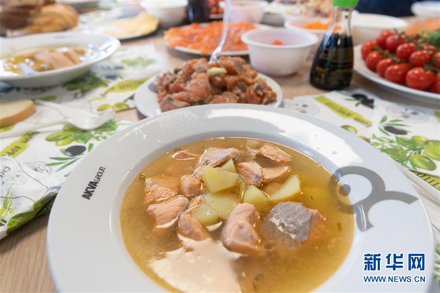 这是9月13日在俄罗斯摩尔曼斯克以北的巴伦支海域的鲑鱼养殖场拍摄的鲑鱼汤。 新华社记者白雪骐摄