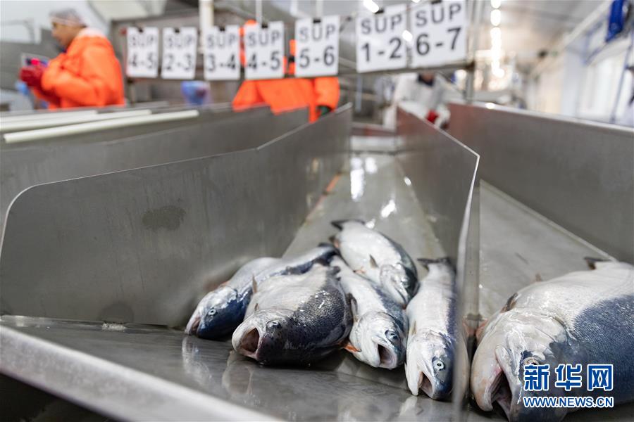 这是9月13日在位于俄罗斯摩尔曼斯克的俄罗斯水产养殖公司车间内拍摄的分拣后的鲑鱼。 新华社记者白雪骐摄