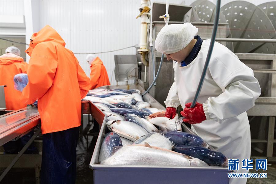 9月13日,在俄罗斯摩尔曼斯克,俄罗斯水产养殖公司工作人员清洗鲑鱼。 新华社记者白雪骐摄