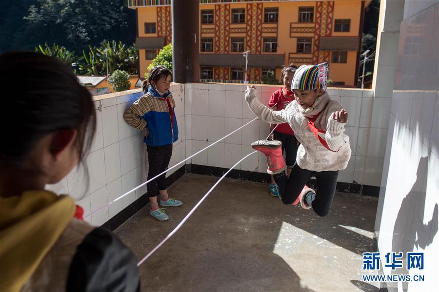 在独龙江乡中心小学,孩子们在跳皮筋(2016年11月23日摄)。新华社记者胡超摄