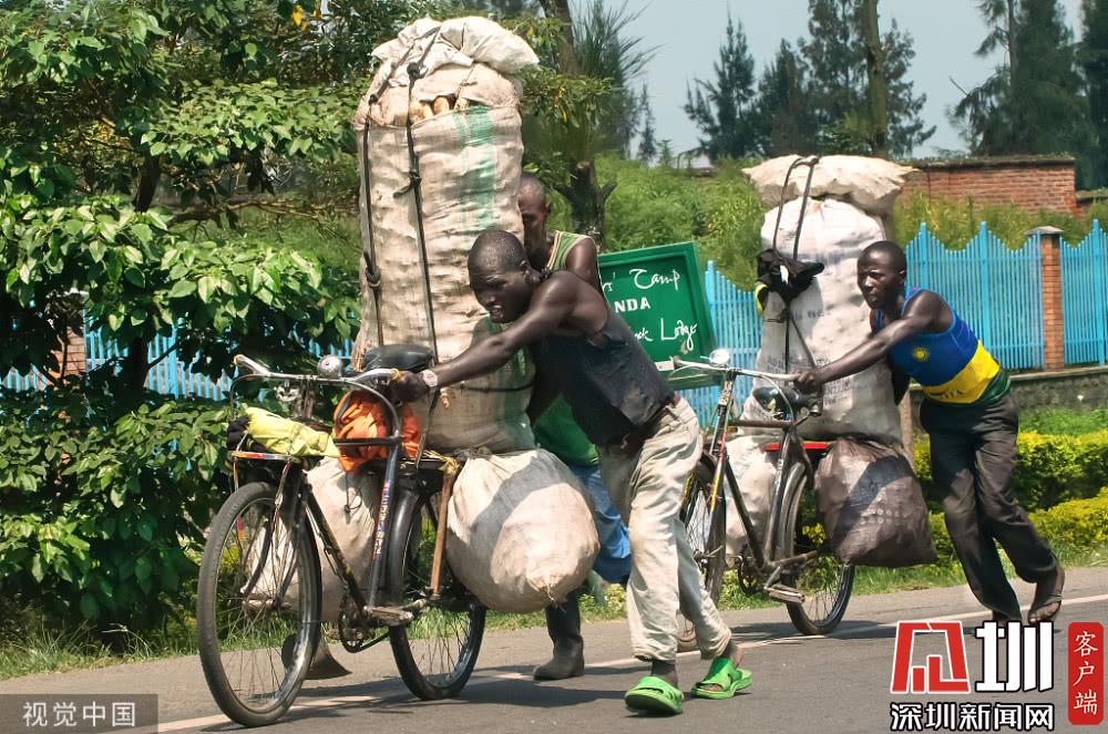 卢旺达,刚果和邻国卢旺达的工人们每次要走20英里(约32公里)来运输他们的货物。从小村庄、农场到城镇里的市场,很多不同的货物,如床垫和卷心菜都被小心地固定在了自行车上,它们要被挂着走很远的路,之后到市场上被卖掉。一张图拍摄的是一个人骑着一辆自行车,车后面载了7种不同颜色的床垫。很多自行车上都绑着装大土豆的麻袋,这些麻袋重达30英石(约18千克),工人们将会把它们运到市场上卖掉。