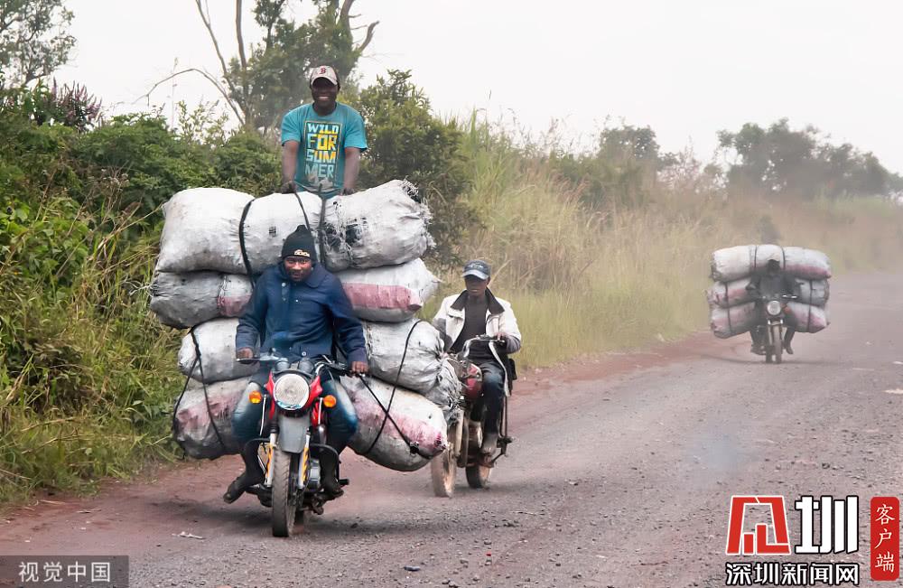 刚果,工人们将装满木炭的麻袋放在摩托车上,从维龙加国家公园运到刚果戈马市。