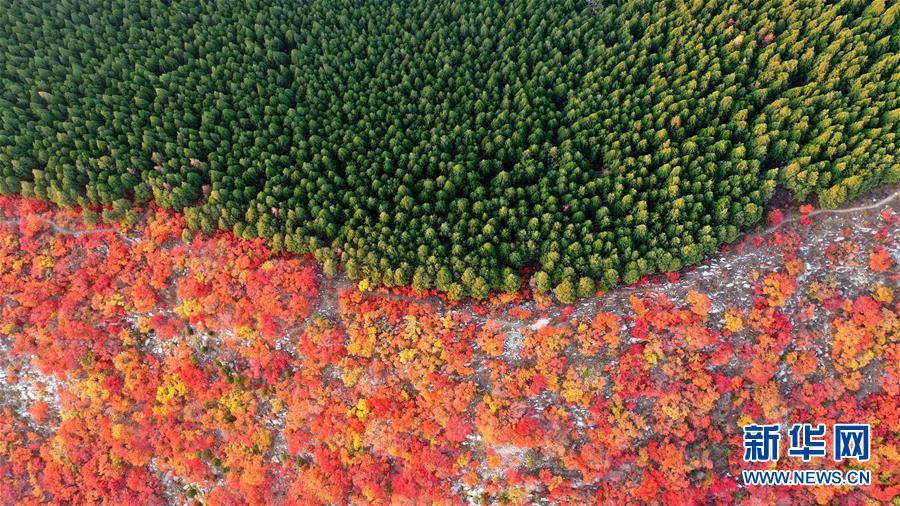火红的黄栌树林与绿色的松林沿济南蝎子山山脊分布(11月4日无人机拍摄)。 新华社记者 朱峥 摄