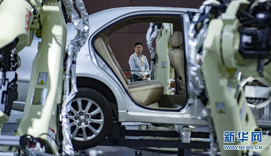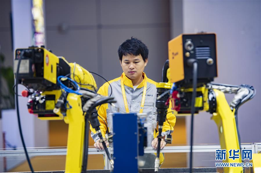 11月5日,在第二届进博会装备展区,工作人员在沪工国际(香港)有限公司展台前查看点焊机器人设备运行情况。新华社记者普布扎西摄