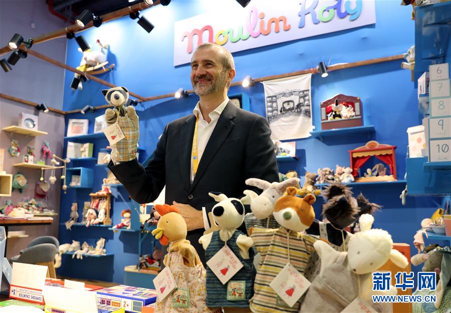 11月5日,在第二届进博会品质生活展区,来自法国的玩具品牌展商手持儿童手偶玩具。新华社记者刘颖摄