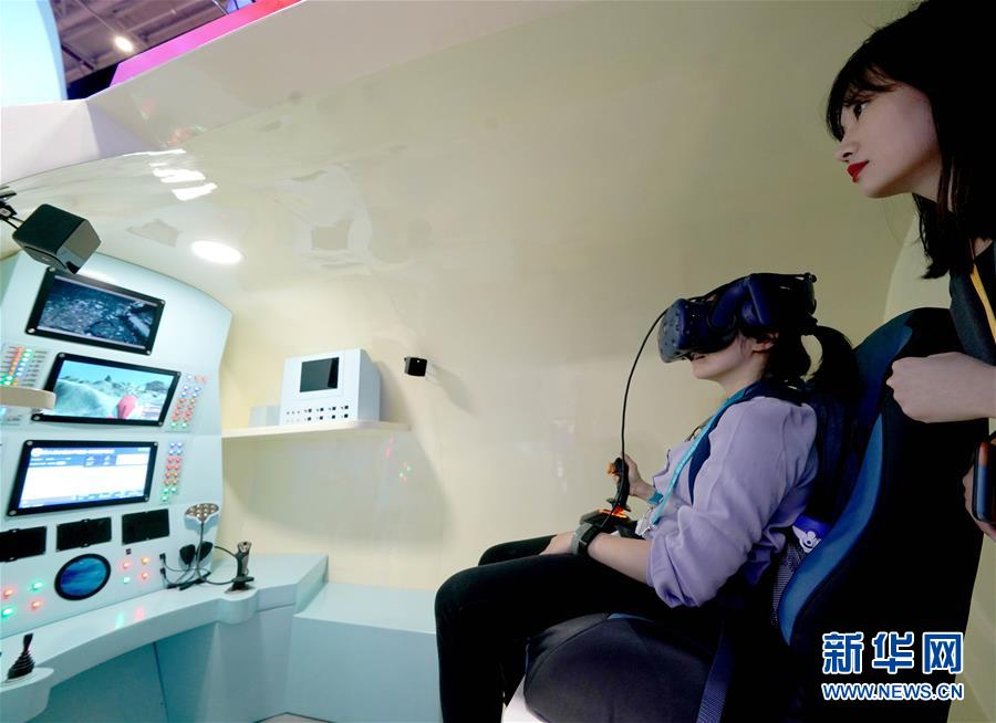 11月5日,观众在第二届进博会中国馆“深海勇士”体验仓内体验。新华社记者陈建力摄
