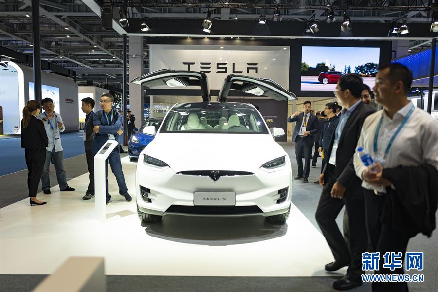 11月5日,参观者在第二届进博会汽车展区特斯拉展台参观。新华社记者普布扎西摄