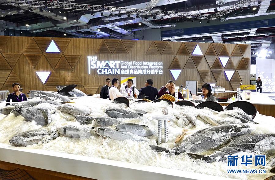 11月5日,参观者在食品及农产品展区全球食品集成分销平台参观。新华社记者才扬摄