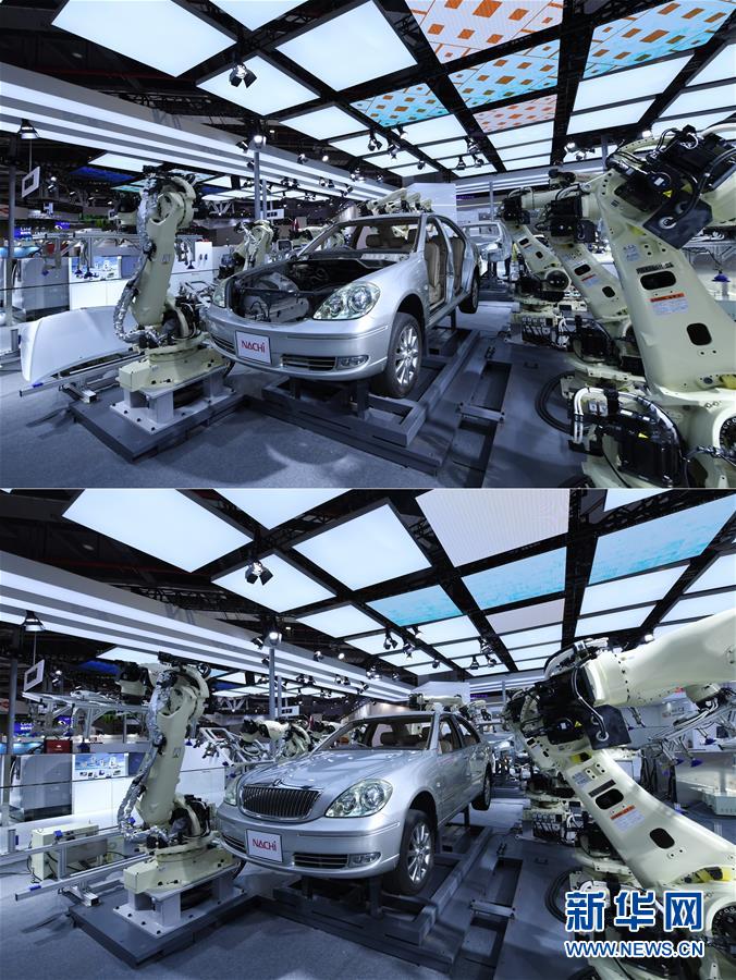 11月5日在第二届进博会装备展区日本那智不二越公司展台拍摄的拼版照片。上图是NACHI超高速点焊SRA系列机器人操作前的汽车骨架;下图为间隔一分钟后拍摄的NACHI超高速点焊SRA系列机器人操作后的汽车外壳。新华社记者范培珅摄
