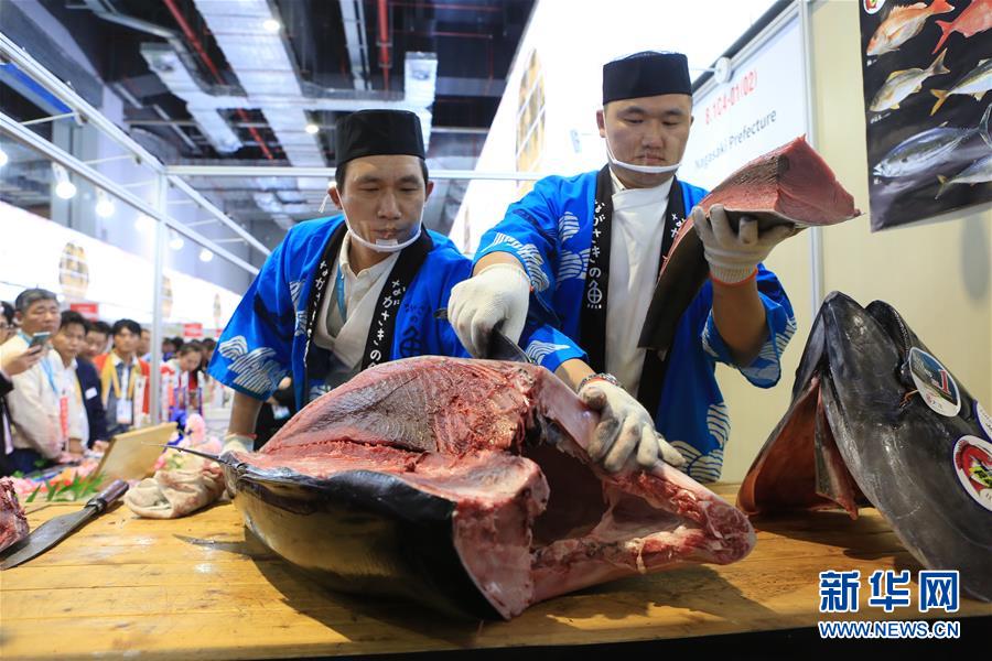 新11月7日,来自日本长崎鱼市株式会社的专业切鱼师傅在现场解体70公斤蓝鳍金枪鱼。第二届中国国际进口博览会正在上海国家会展中心举行。博览会的食品及农产品展区里汇集了来自世界各地的美食,同时也上演各种精彩美食秀。11月7日,来自日本长崎鱼市株式会社的专业切鱼师傅现场解体一条70公斤的蓝鳍金枪鱼,吸引大量参观者观看、品尝。新华社记者隋先凯摄