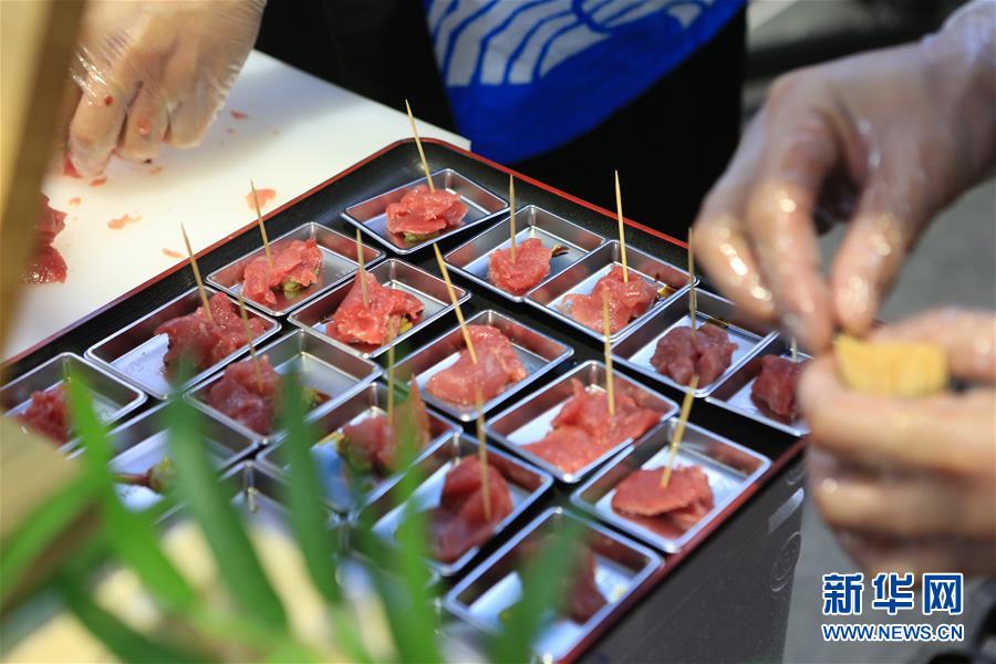 11月7日,切鱼师傅为参观者准备用于品尝的蓝鳍金枪鱼鱼肉。第二届中国国际进口博览会正在上海国家会展中心举行。博览会的食品及农产品展区里汇集了来自世界各地的美食,同时也上演各种精彩美食秀。11月7日,来自日本长崎鱼市株式会社的专业切鱼师傅现场解体一条70公斤的蓝鳍金枪鱼,吸引大量参观者观看、品尝。新华社记者隋先凯摄