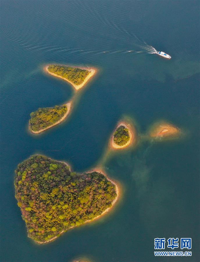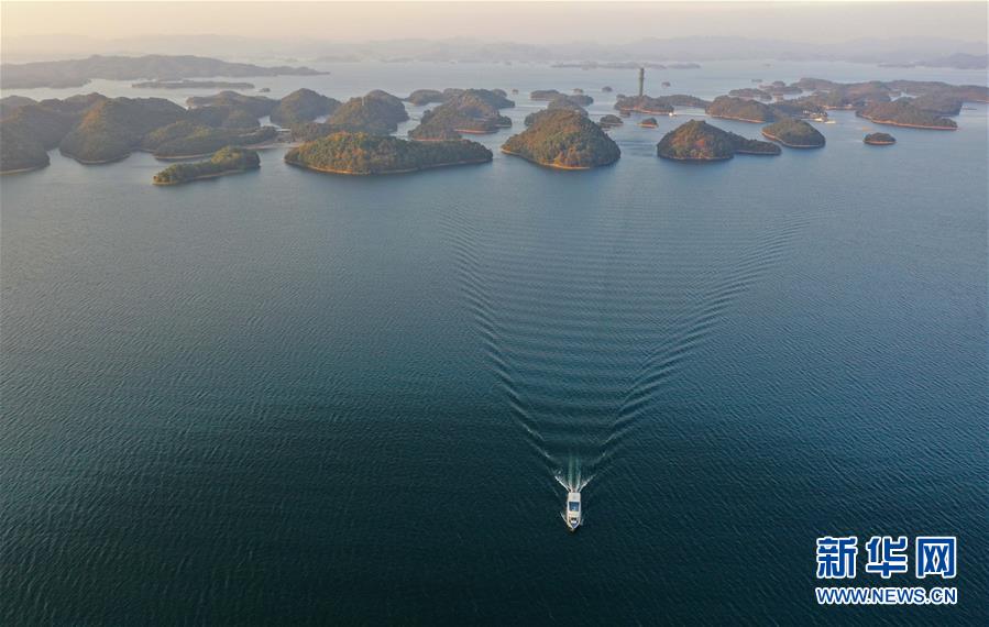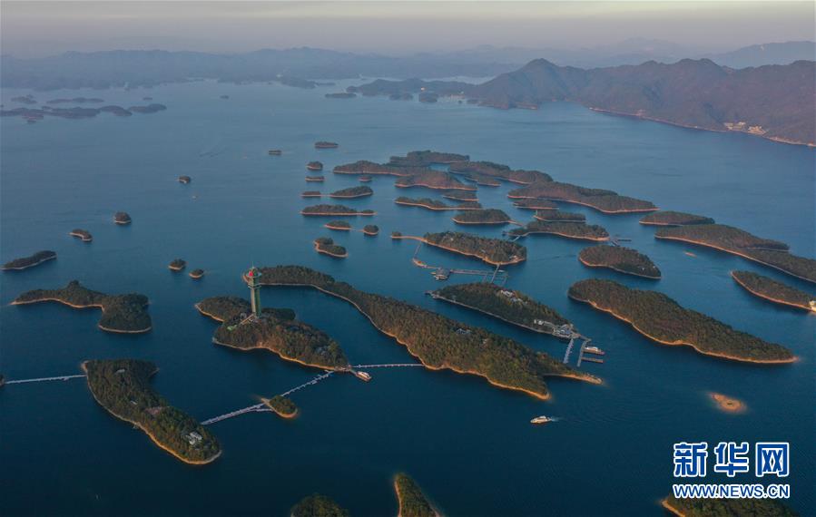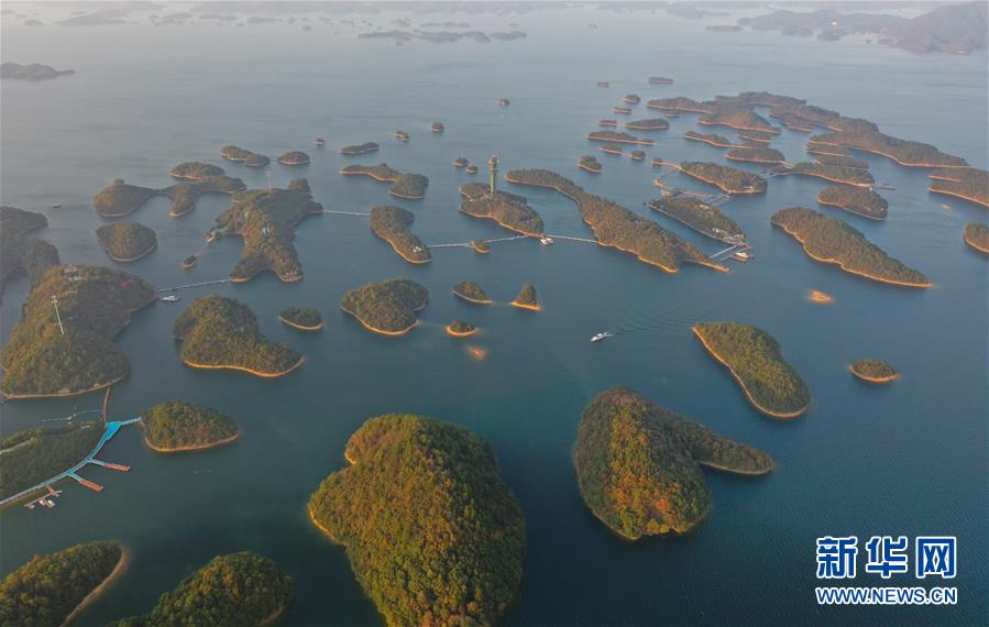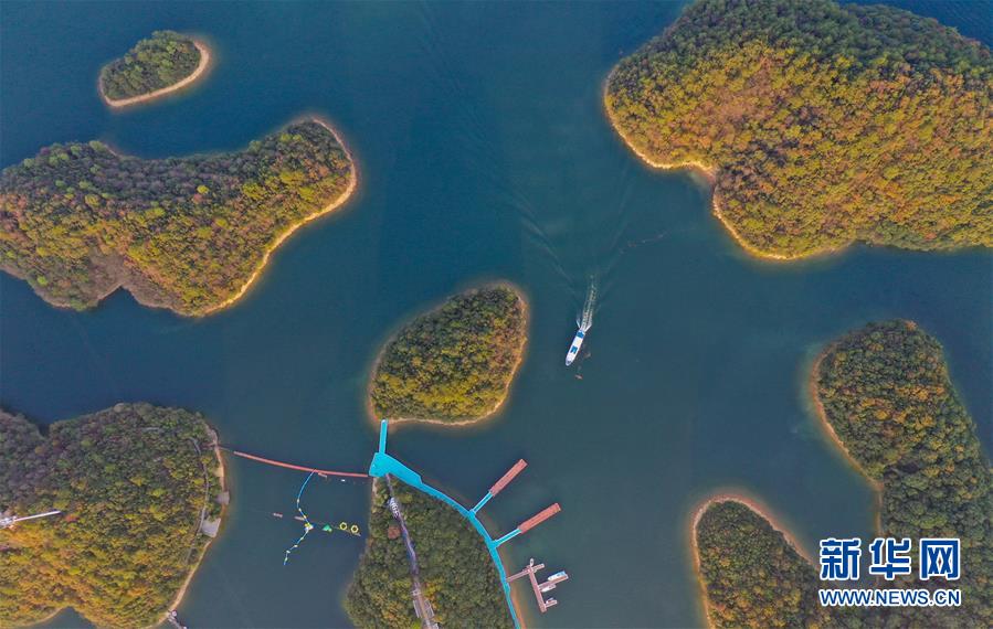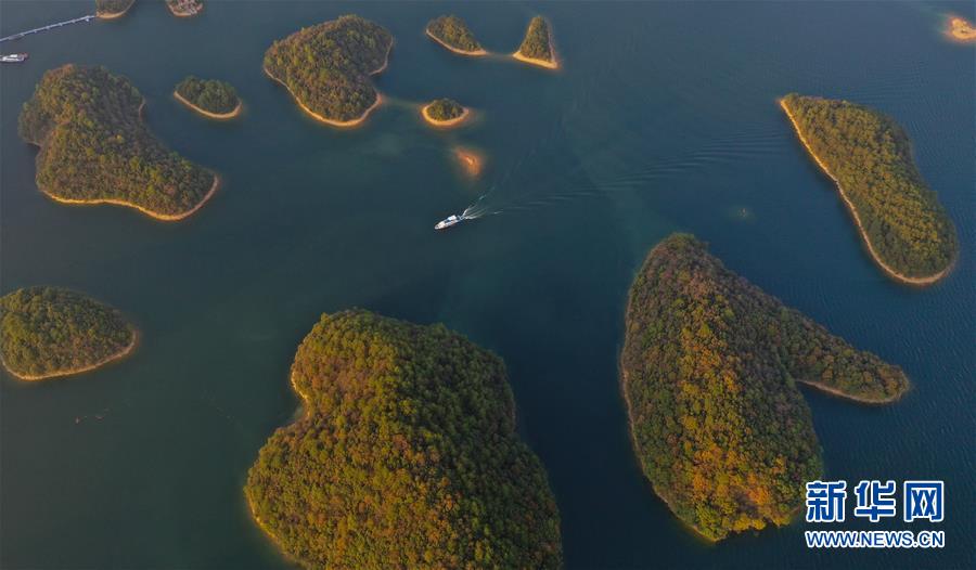 11月9日无人机拍摄的庐山西海。 当日,落日余晖下的江西庐山西海山青水蓝,美不胜收。 新华社记者 周密 摄