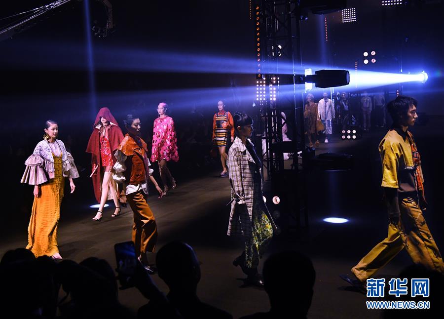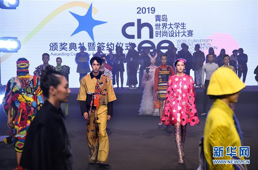 11月9日,模特在闭幕仪式上展示服装。 当日,为期3天的2019青岛世界大学生时尚设计大赛在山东省青岛市落下帷幕。据介绍,本次大赛展示了国内外25所设计院校的青年设计师的50套服装作品。 新华社记者 李紫恒 摄