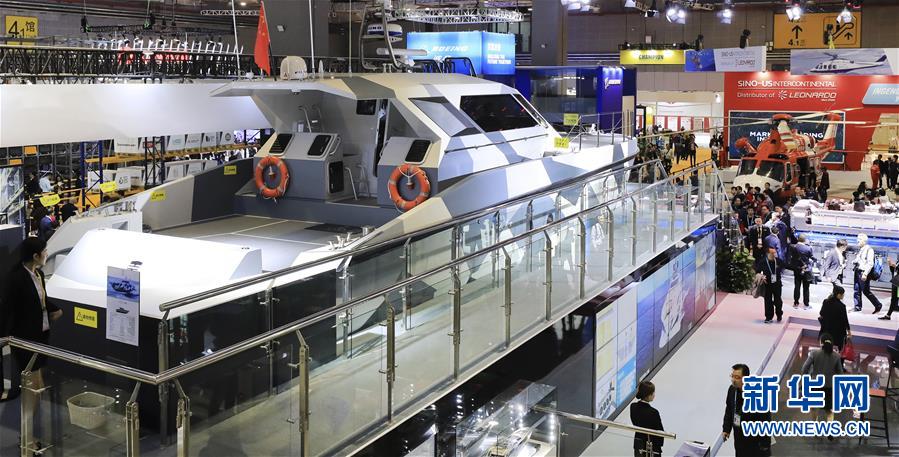 这是在第二届进博会装备展区拍摄的法拉帝公司的FSD195高速公务巡逻船(11月8日摄)。这艘全长20米、重约37吨的公务船大量采用碳纤维和钛金属等新型材料。新华社记者方喆摄