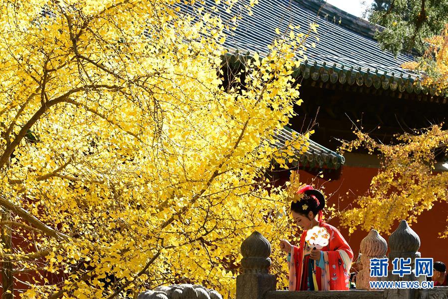 11月11日,一名汉服爱好者在大觉寺内的古银杏树旁留影。新华社记者尹栋逊摄