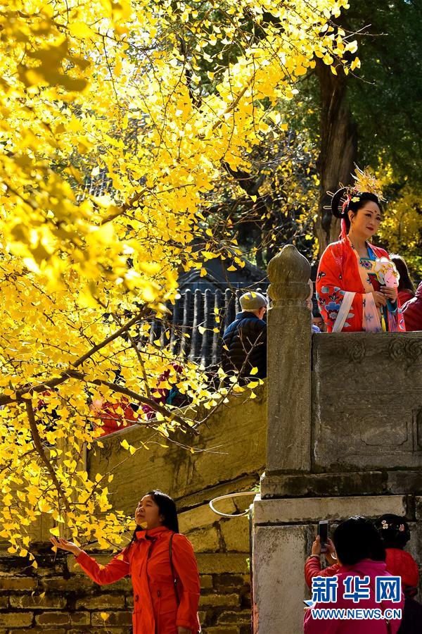 11月11日,人们在大觉寺内的古银杏树旁留影。新华社记者尹栋逊摄