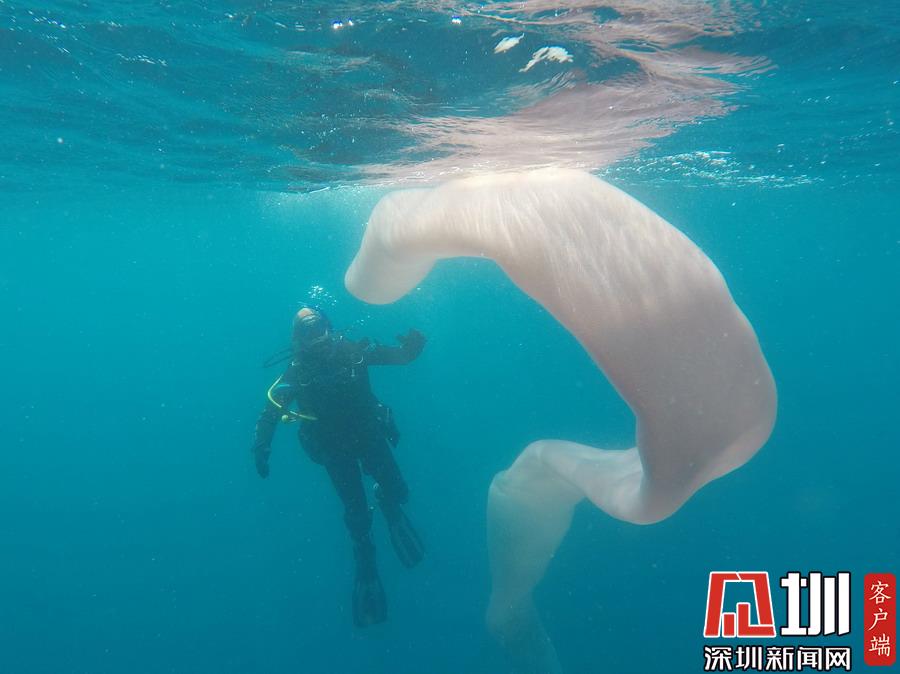 2018年11月13日报道,10月25日,潜水员Andrew Buttle和好友Steve Hathaway来到新西兰最活跃火山之一的怀特岛附近海域潜水,正当他们在海中潜游之时,突然发现远处出现了一条巨大的白带,在海水中摇曳生姿,仿若一个鼓鼓的风向袋。带着好奇心,Andrew和Steve慢慢靠近这个神秘的东西,仔细一看,发现这并非什么白色绸带,也不是风向袋,而是一条硕大的蛀船虫,这个神奇的海洋软体生物长达整整8米多,上面附着着成千上万个有机体,模样十分骇人。