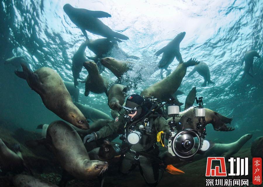 32岁的 Maxwel Hohn是一名水下摄影师,日前,他潜入加拿大温哥华海域,没想到撞见海狮“大军”,这50来只家伙对于 Maxwel的出现兴奋不已,立刻将他团团围住,仿佛进了盘丝洞。