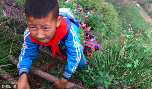 四川省凉山彝族自治州昭觉县支尔莫乡阿土勒尔村,是一座名副其实的“悬崖村”,72户人家居住在这里,处于美姑河大峡谷断坎岩肩斜台地,海拔1400多米,与地面垂直距离约800米。5月14日,放学路上,孩子们在攀爬藤梯。 图片来源:视觉中国