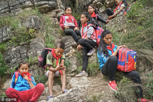 5月14日是家长接孩子的日子,清晨6点多,30多岁的陈古吉带着背包绳和另外两个家长一起下山接孩子。村里身手敏捷的年轻人,下山通常需要1小时,上山大约90分钟,对于外来的人,通常是这个时间的两倍。 图片来源:视觉中国