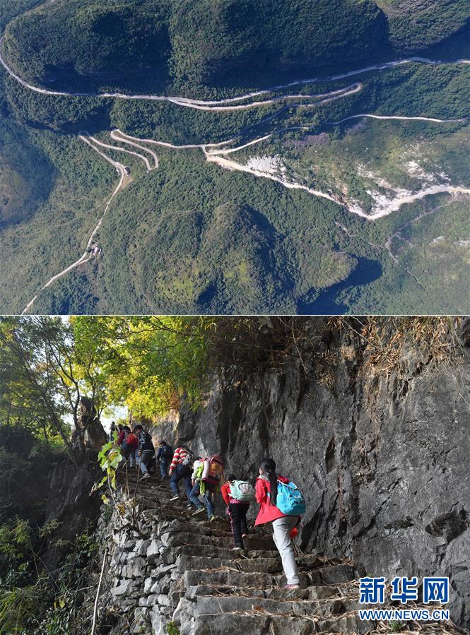 拼版照片:上图为大化瑶族自治县七百弄乡弄良村弄丘屯刚刚修通的公路(右下段)和村道、乡道连接(11月12日无人机拍摄);下图为在尚未通路的弄良村弄丘屯,孩子们爬“天梯”回家(2016年12月9日摄)。新华社记者 黄孝邦 摄
