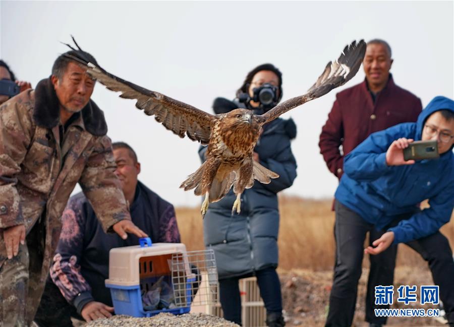 11月16日,在乐亭县野生动物保护协会大清河鸟类救助站,工作人员放飞一只普通鵟。新华社记者杨世尧摄